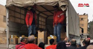 الحسكة-سانا وزع فرع منظمة الهلال الأحمر العربي السوري في الحسكة مساعدات إغاثية وغذائية على الأسر التي استضافت عوائل نازحة