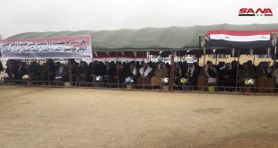 الحسكة-سانا أقام أهالي قرية البوير جنوب مدينة القامشلي خيمة وطن بمشاركة العشائر العربية في المنطقة للتأكيد على دعم الجيش العربي السوري في حربه على الإرهاب التكفيري ورفضاً لأي وجود غير شرعي للقوات الأجنبية على الأراضي السورية. وأكدت الكلمات التي القيت …