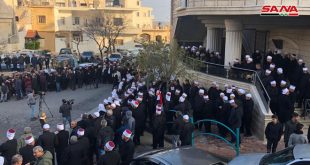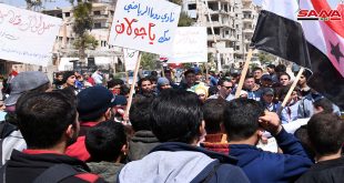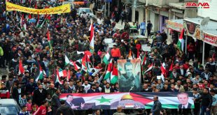 ريف دمشق-القنيطرة-سانا نظمت القوى والهيئات والفعاليات الفلسطينية والسورية في مخيم سبينة بريف دمشق اليوم مسيرة جماهيرية إحياء ليوم الأرض ووقفة احتجاجية استنكاراً ورفضاً لإعلان الرئيس الأميركي دونالد ترامب حول الجولان السوري المحتل. وانطلقت المسيرة من أمام جامع معاذ بن جبل …