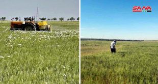 السويداء-سانا كافحت مديرية زراعة السويداء حشرة السونة في حقول مزروعة بمحصول القمح مساحتها نحو 7 آلاف دونم بشكل مجاني تفاديا لأضرارها المؤدية إلى انخفاض الوزن والقدرة الإنباتية للحبوب المصابة. وذكر رئيس دائرة الوقاية بالمديرية المهندس حاتم البربور في تصريح لمراسل …