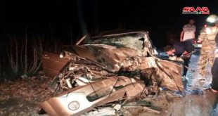 السويداء-سانا توفي شخصان وأصيب 7 آخرون مساء اليوم جراء حادث تصادم سيارتين على طريق السويداء صلخد. وذكر مدير منطقة صلخد العقيد إحسان عيسى في تصريح لمراسل سانا أن سيارتين (فان اتش ون) و(كيا سيراتو) خاصة اصطدمتا وجها لوجه بمنطقة سد …
