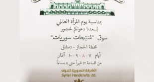 دمشق-سانا احتفاء بعيد المرأة العالمي تشارك أكثر من 25 سيدة من كل المحافظات في سوق “منتجات سوريات” الذي سيفتتح غداً في محطة الحجاز