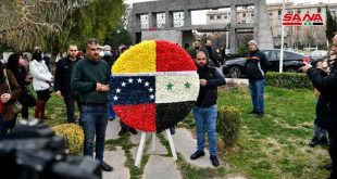 دمشق-سانا أحيت جامعة دمشق اليوم الذكرى السنوية التاسعة لرحيل الزعيم الفنزويلي هوغو تشافير بوضع إكليل من الزهور على النصب التذكاري