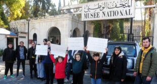 دمشق-سانا تقف الطفلة ميرال ذات العشر سنوات أمام المتحف الوطني بدمشق، حاملة لافتة تطالب بحماية الآثار السورية من عمليات التنقيب غير الشرعي