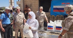 درعا-سانا قدم مركز التنسيق الروسي مساعدات طبية ومواد غذائية للأهالي في مدينة بصرى الشام
