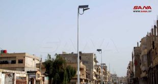 درعا-سانا أنار مجلس مدينة درعا الطريق الواصل من ساحة بصرى إلى سوق الحامد حتى الشارع المؤدي إلى المجمع الحكومي بالطاقة الشمسية.
