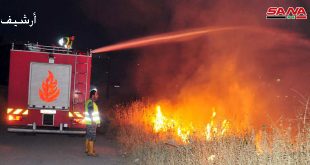 درعا-سانا أخمد فوج إطفاء درعا 6 حرائق اندلعت أمس بمناطق عدة في المحافظة. وبين العقيد محمد محاميد قائد فوج الإطفاء في تصريح لمراسلة سانا اليوم أنه تم إخماد 4 حرائق اندلعت في مساحات من الأعشاب اليابسة بمدينة درعا وحريقين اندلعا …