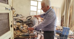 درعا-سانا في ورشته الصغيرة التي تعج ببقايا الأخشاب والمعدات البسيطة يمضي محمد ياسر الحاصباني وقته في عالم الإبداع وصناعة