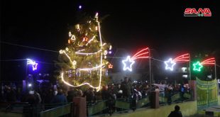 دير الزور-سانا أقامت محافظة دير الزور احتفالية في دوار الانتصار بدير الزور تم خلالها إضاءة شجرة الميلاد وإطلاق ألعاب نارية وأضواء وموسيقا وأغاني أعياد الميلاد وتوزيع هدايا للأطفال وفقرات فنية قدمتها فرقة قصب الموسيقية. وأشارت عضو المكتب التنفيذي لمحافظة دير …