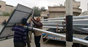 حماة-سانا باشر فرع التوتر العالي بحماة “السورية للشبكات” أعمال تنفيذ مشروع تركيب أجهزة إنارة بالطاقة الشمسية في مدينة سلمية