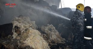 حماة-سانا أخمد عناصر فوج إطفاء حماة حريقاً شب في أحد مستودعات بالات الصوف الخام في حي المزارب في مدينة حماة.
