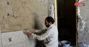 حمص-سانا تسير أعمال تأهيل وترميم مدرسة طارق بن زياد بوتيرة عالية في حي البياضة بحمص. تصوير سامر الشامي
