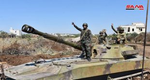 حماة-سانا في الذكرى الخامسة والسبعين لتأسيسه يجدد بواسل الجيش العربي السوري تأكيد العهد بالنصر ويدهم على الزناد وهاماتهم مرفوعة وعيونهم على إدلب الخضراء فالجيش أت لا محالة لتطهيرها ودحر التنظيمات الإرهابية عنها وهزيمة مخططات أعداء الوطن من العثمانيين الجدد والدول …