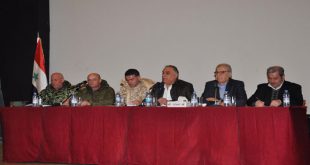 حمص – سانا عقد على مسرح المركز الثقافي العربي بحمص اجتماع موسع ضم قيادات وفعاليات رسمية ودينية وأهلية ومديري المؤسسات العامة والنقابات المهنية لمناقشة سبل تعزيز المشاركة بالالتحاق بالفيلق الخامس الطوعي الذي شكلته القيادة العامة للجيش والقوات المسلحة للعمل إلى …
