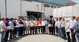 حمص-سانا بمناسبة عيد العمال وتقديراً لجهود الطبقة العاملة كرم اتحاد نقابات عمال حمص 50 عاملاً من العمال المميزين في عدد من منشآت القطاع الخاص