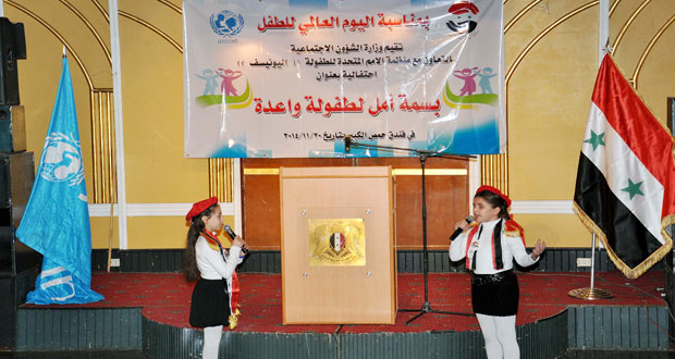 حمص-سانا بمناسبة اليوم العالمي للطفل أقامت وزارة الشؤون الاجتماعية اليوم بالتعاون مع منظمة الأمم المتحدة للطفولة “اليونيسيف” احتفالية بعنوان “بسمة أمل لطفولة واعدة” وذلك في فندق حمص الكبير. وتضمنت الاحتفالية عرض فيلم وثائقي يفضح الممارسات الإرهابية ضد الطفولة في سورية …
