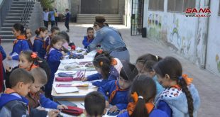 حمص-سانا نظمت مدرسة عكرمة المخزومي بحمص اليوم ورشة رسم عبر خلالها الأطفال بلوحاتهم التي أنجزوها عن تضامنهم