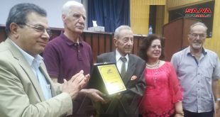 حمص-سانا كرم فرع حمص لاتحاد الكتاب العرب اليوم الباحث والناقد السوري الكبير حنا عبود من خلال ندوة موسعة أقيمت في ثقافي حمص
