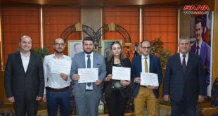 حمص-سانا كرمت جامعة البعث في حمص اليوم أربعة من طلبتها المتميزين الذين سجلت أبحاثهم العلمية في مجلات محكمة عالمياً ومنحوا براءات اختراع.