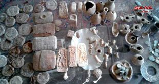 حمص-سانا عثرت مجموعة من العمال بحمص أثناء عملهم بإزالة الأنقاض من المدينة القديمة داخل بناء مهجور على حقيبة جلدية كبيرة تحتوي العديد من القطع الأثرية