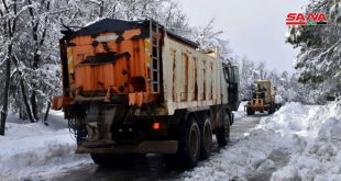 حمص-سانا بدأت آليات وورشات مديرية الخدمات الفنية في محافظة حمص منذ ساعات الصباح الأولى أعمال إزالة الثلوج المتراكمة