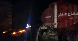 حمص-سانا أخمد كوادر إطفاء حمص مساء اليوم حريقاً نشب بمخلفات نفطية قرب قرية الزرزورية غرب مدينة حمص. وأفاد العميد غياث عاقل مدير فرع الدفاع المدني بحمص في تصريح لمراسل سانا بأن غرفة عمليات الفرع تلقت بلاغاً حول حريق قرب قرية …