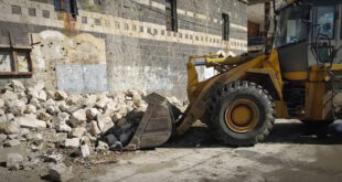 حمص-سانا تواصل مديرية الخدمات الفنية بحمص أعمال إزالة الأنقاض والحواجز الإسمنتية في مختلف مناطق المدينة،