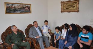 حمص-سانا بمناسبة عيد الشهداء وإكراما وإجلالا لأرواح شهدائنا الأبرار وتقديرا لعظيم ما قدموه كرم محافظ حمص طلال البرازي وقائد شرطة محافظة حمص اللواء خالد هلال عددا من أسر شهداء وجرحى قوى الأمن الداخلي في منازلهم. وخلال الزيارة أكد محافظ حمص …
