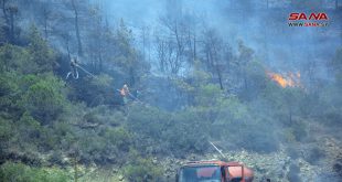 اللاذقية-سانا لليوم الخامس على التوالي تواصل فرق الإطفاء جهودها الكبيرة، للسيطرة على النيران المندلعة في الغابات والأحراج بريف اللاذقية الشمالي.