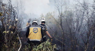 اللاذقية-سانا تعمل فرق الإطفاء في الدفاع المدني السوري، على تقسيم المنطقة المندلعة فيها النيران، في جبل التركمان بمنطقة ربيعة في ريف محافظة اللاذقية إلى قطاعات