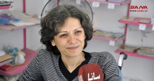 اللاذقية-سانا على كرسيها المتحرك وبابتسامة تشع أملاً وإشراقاً تستقبل أمل أسعد لايقة زوار مكتبتها