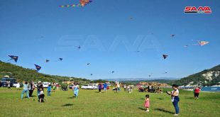 اللاذقية-سانا أكثر من 400 طفل وطفلة من أبناء الشهداء والجرحى والمحررين والمهجرين شاركوا في مهرجان الطائرات الورقية في قرية الطارقية التابعة لبلدة مشقيتا على بحيرة سد 16 تشرين بريف اللاذقية. طائرات ورقية زاهية الألوان حلقت في السماء الزرقاء لتعانق أحلام …