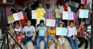 اللاذقية-سانا تنتظر الطفلة نايا محمود مع أهلها أمام ملتقى علاء نافذ سليمان في حي المشروع السابع لاستقبال الأطفال المشاركين في مسابقات الرواد على مستوى سورية التي تستضيفها اللاذقية حاملة لوحة ترحيب بطفلتين لا تعرف سوى اسميهما. علامات السعادة تظهر واضحة …