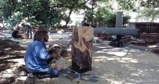 اللاذقية- سانا تحولت القطعة الخشبية التي تزيد على متر بقليل بيدي الفنان إياد بلال وأدواته بعد مضي أيام قليلة من ملتقى أغافي للنحت على الخشب في المتحف الوطني باللاذقية إلى منحوتة فنية تجمع وجوه ثلاثة أشخاص يصعدون إلى السماء وكأنه قيامة …