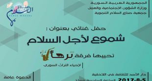 اللاذقية- سانا انطلاقا من هدفها بنشر ثقافة السلام عن طريق الفن وتعميق ثقافة التراث الوطني أقامت جمعية صناع السلام مساء اليوم حفلا غنائيا موسيقيا بعنوان “شموع لأجل السلام” أحيتها فرقة ترحال الموسيقية. وقدمت الفرقة التي ضمت 8 عازفين و3 مغنين باقة …