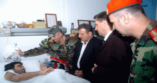 اللاذقية-سانا بمناسبة عيد الفطر السعيد كرم محافظ اللاذقية ابراهيم خضر السالم وأمين فرع حزب البعث العربي الاشتراكي الدكتور محمد شريتح بواسل الجيش العربي السوري على إحدى النقاط العسكرية في قمة النبي يونس بالريف الشمالي وجرحى الجيش في مشفى الشهيد زاهي …