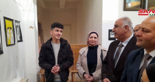 ريف دمشق-سانا يتنقل غيث علوش ابن الستة عشر عاماً في معرضه الأول ليشرح للزوار عن لوحاته التي اختار مواضيعها لتعبر عن