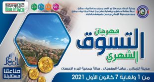 دمشق-سانا ينطلق غداً مهرجان التسوق الشهري “صنع في سورية” بدورته الـ “129” في الزبداني. ويستمر المعرض الذي تنظمه غرفة صناعة دمشق وريفها بالتعاون مع غرفة تجارة ريف دمشق حتى السابع من كانون الأول المقبل. عضو مجلس إدارة غرفة صناعة دمشق …