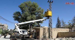ريف دمشق-سانا جهد كبير وعمل شاق ودؤوب يبذله عمال ورشات الصيانة في وزارة الكهرباء لإعادة التيار الكهربائي الى مدينة عربين بريف دمشق لتثبيت استقرار الأهالي بمنازلهم التي عادوا إليها بعد تحريرها من الإرهاب لمواصلة حياتهم بشكل طبيعي. كاميرا سانا جالت …