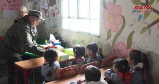 ريف دمشق-سانا وزع مركز التنسيق الروسي اليوم مساعدات إنسانية على مجموعة من الأطفال في روضة مركز الإقامة المؤقتة ببلدة الحرجلة في ريف دمشق.