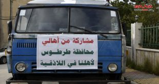 طرطوس-سانا سيرت محافظة طرطوس اليوم ثلاث سيارات تابعة لفرع السورية للتجارة وبدعم من فعاليات أهلية محملة بما يزيد عن 800 سلة