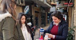 طرطوس-سانا على طاولة خشبية صغيرة وسط مدينة بانياس بطرطوس تضع الشابة أريج مستلزماتها وأدواتها البسيطة المخصصة لصنع المشروبات الساخنة