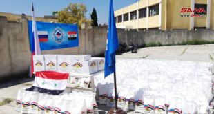 طرطوس-سانا وزع مركز التنسيق الروسي في حميميم مساعدات انسانية لأهالي قرية بيت خميس بريف الدريكيش