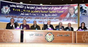حلب-طرطوس-سانا طالب أعضاء المؤتمر السنوي لنقابة عمال الطباعة والثقافة والإعلام في حلب بإعادة طباعة جريدة الجماهير ورقيا وتثبيت العاملين المؤقتين فيها وتأمين التغذية الكهربائية الدائمة لها وإقامة المزيد من مسابقات التوظيف وملء الشواغر في كل الدوائر والمؤسسات وخاصة مديرية التربية …