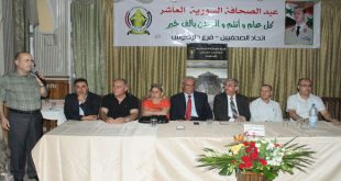 طرطوس-سانا بمناسبة يوم الصحافة السورية أقام فرع اتحاد الصحفيين بطرطوس أمس حفلا تكريميا لعدد من الصحفيين العاملين والمشاركين والفائزين بمسابقة الفرع لاختيار مقالات صحفية متميزة واسر الصحفيين المتوفين والطلاب المتفوقين في شهادات التعليم الأساسي والثانوي والجامعي من أبناء الصحفيين وذلك …