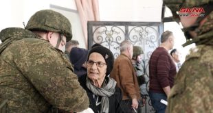 طرطوس-سانا قام عسكريون تابعون لمركز التنسيق الروسي بتوزيع مساعدات غذائية إلى سكان قرية سرستان بريف