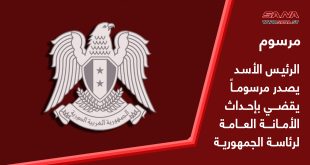 المزيدالرئيس الأسد يصدر مرسوماً يقضي بإحداث الأمانة العامة لرئاسة الجمهورية