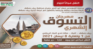 دمشق-سانا تطلق غرفة صناعة دمشق وريفها بالتعاون مع غرفة تجارة ريف دمشق النسخة 116 من مهرجان التسوق الشهري “صنع في سورية” يوم الخميس القادم في صالة نادي النبك الرياضي وذلك بمشاركة أكثر من مئة شركة صناعية محلية. ويضم المهرجان مجموعة …