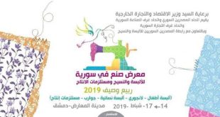 دمشق-سانا يقيم اتحاد المصدرين السوري وغرف الصناعة والتجارة بالتعاون مع رابطة المصدرين السوريين للألبسة والنسيج معرض “صنع في سورية” للألبسة والنسيج ومستلزمات الإنتاج ربيع وصيف 2019 وذلك يوم الخميس المقبل الـ 14 من شباط ولغاية الـ 17 منه على أرض …