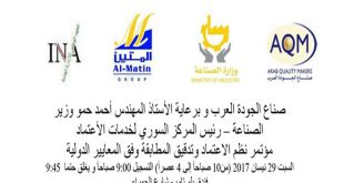 دمشق-سانا تنطلق بعد غد السبت فعاليات مؤتمر نظم الاعتماد وتدقيق المطابقة وفق المعايير الدولية الذي ينظمه بيت الخبرة ” صناع الجودة العرب” بالتعاون مع وزارة الصناعة والمعهد الوطني للإدارة العامة ” إينا” وشركة المتين وذلك في فندق بلو تاور بدمشق. …